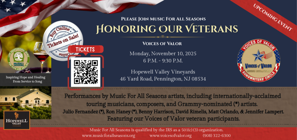 If you’re unable to attend, please consider making a donation to support Voices of Valor and Music For All Seasons to inspire hope and promote healing.